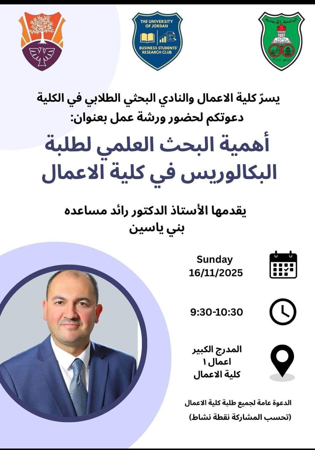 "أهمية البحث العلمي لطلبة البكالوريوس في كلية الأعمال"، قدّمها الأستاذ الدكتور رائد مساعده بني ياسين، الذي تحدّث خلالها عن الدور المحوري للبحث العلمي في بناء المعرفة وتطوير المهارات الأكاديمية لدى الطلبة. وتناول الدكتور مساعده محاور البحث الأساسية، وخطوات إعداد بحث علمي رصين، إلى جانب استعراض أبرز التحديات التي تواجه الطلبة الباحثين وسبل تجاوزها. كما تخللت الورشة نقاشات تفاعلية أغنت اللقاء وأسهمت في تبادل الخبرات بين الطلبة والمحاضر.